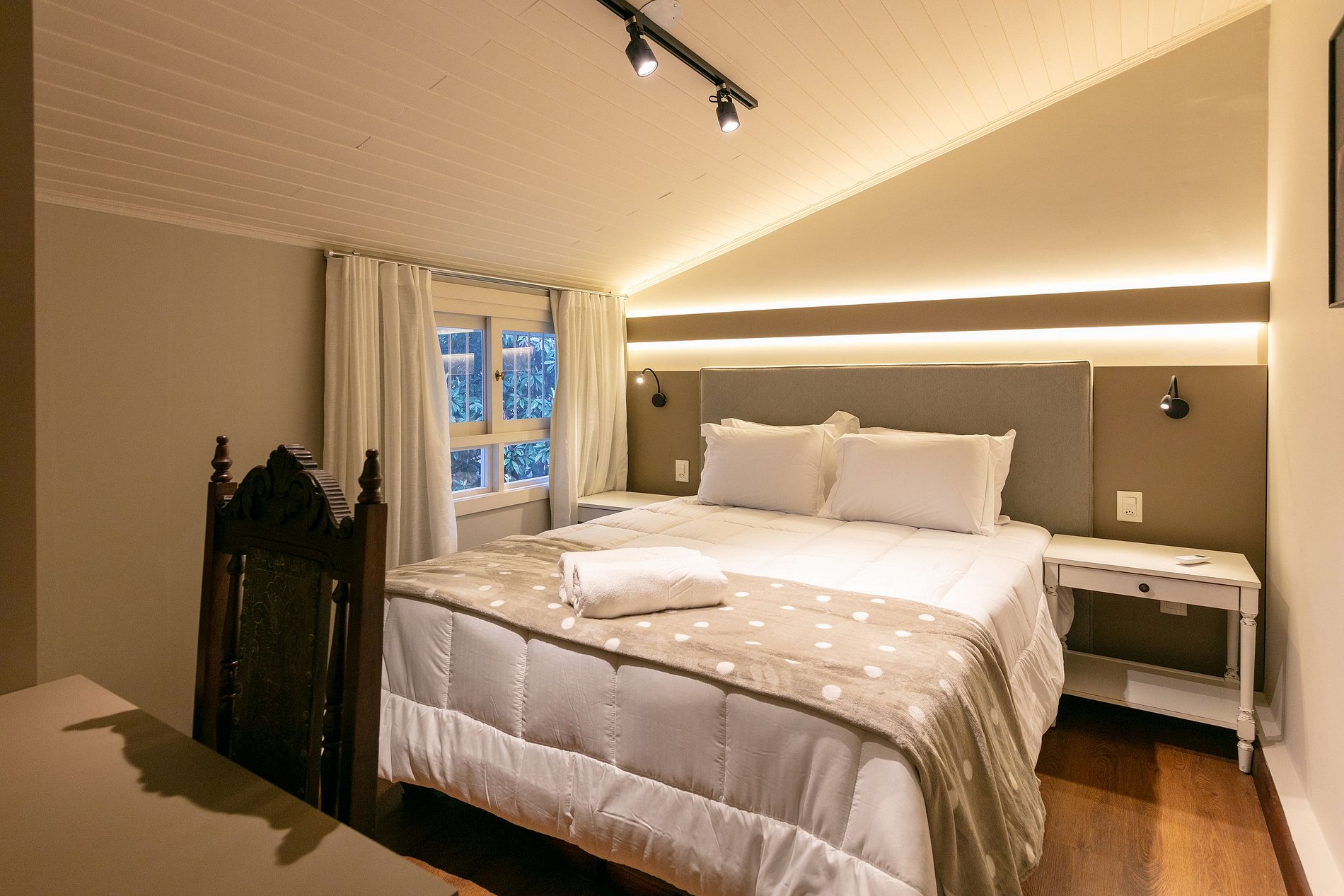 Quarto: Um quarto bem decorado, com cama confortável e roupa de cama de alta qualidade, garantindo um boa noite de sono.
