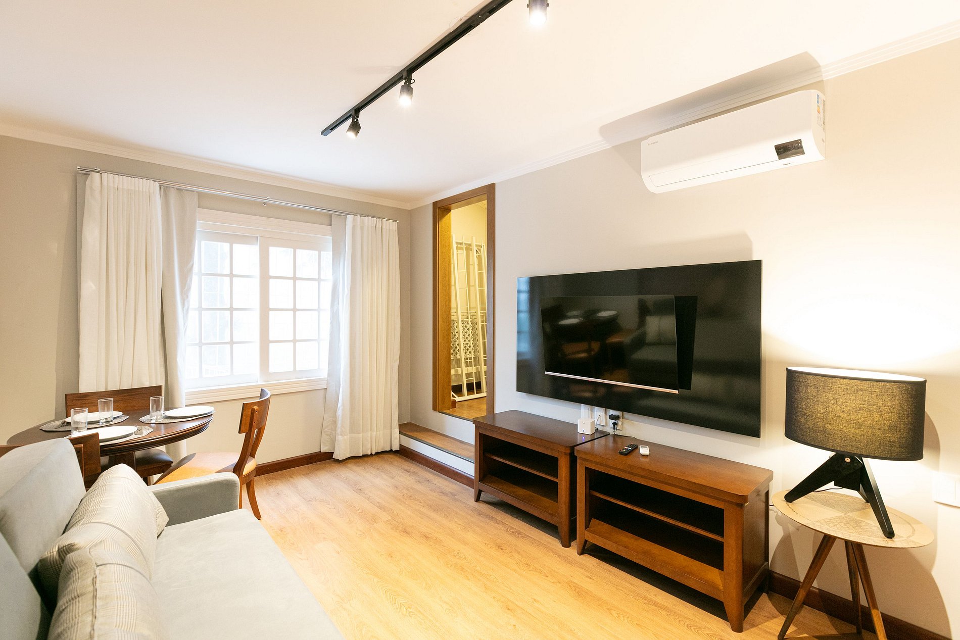 Espaço: Sala de estar arejada e bem iluminada, com sofá confortável e TV de tela plana, ideal para relaxar após um dia explorando a cidade.