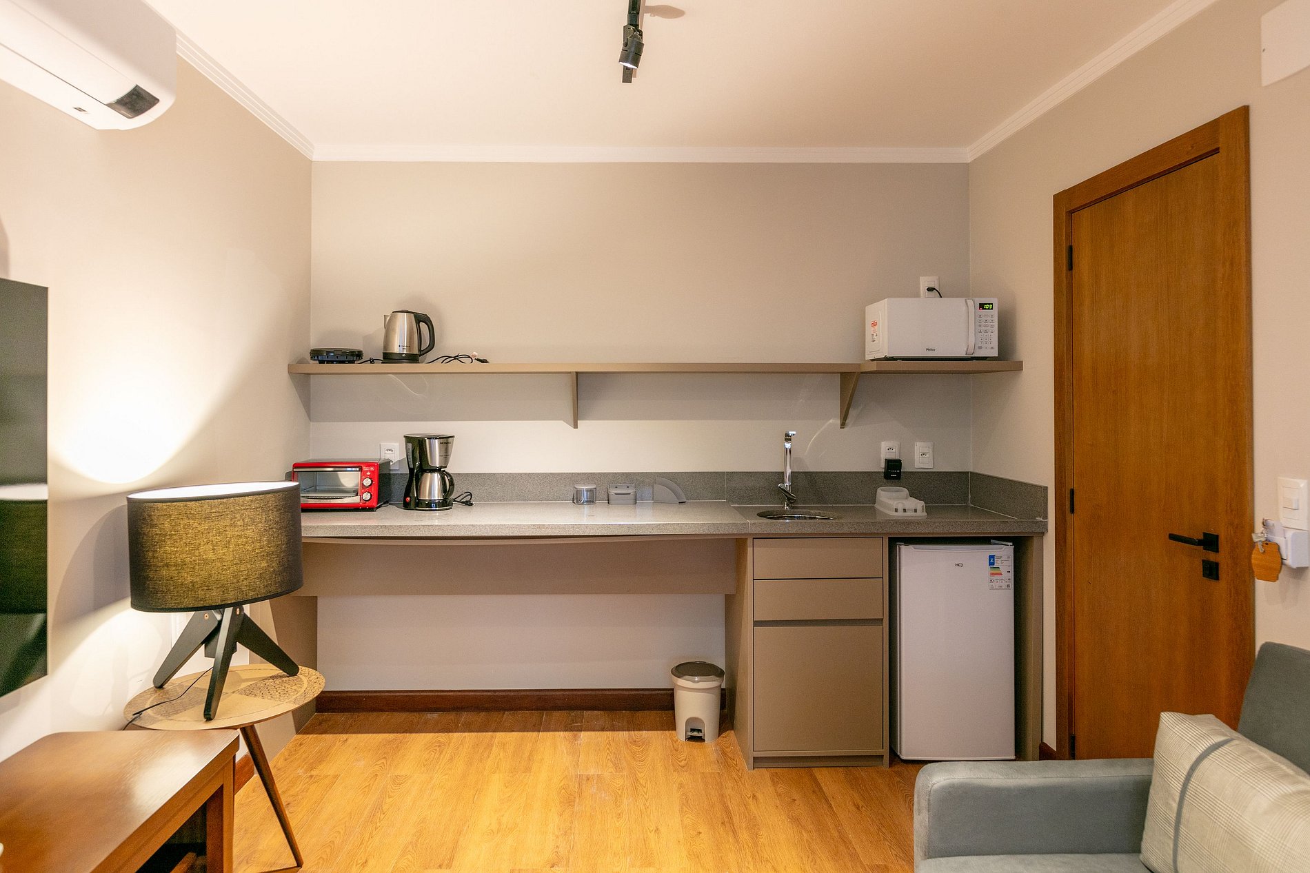 Cozinha: Mini Cozinha equipada com frigobar, micro-ondas e utensílios necessários para um café da manhã ou uma refeição rápida.