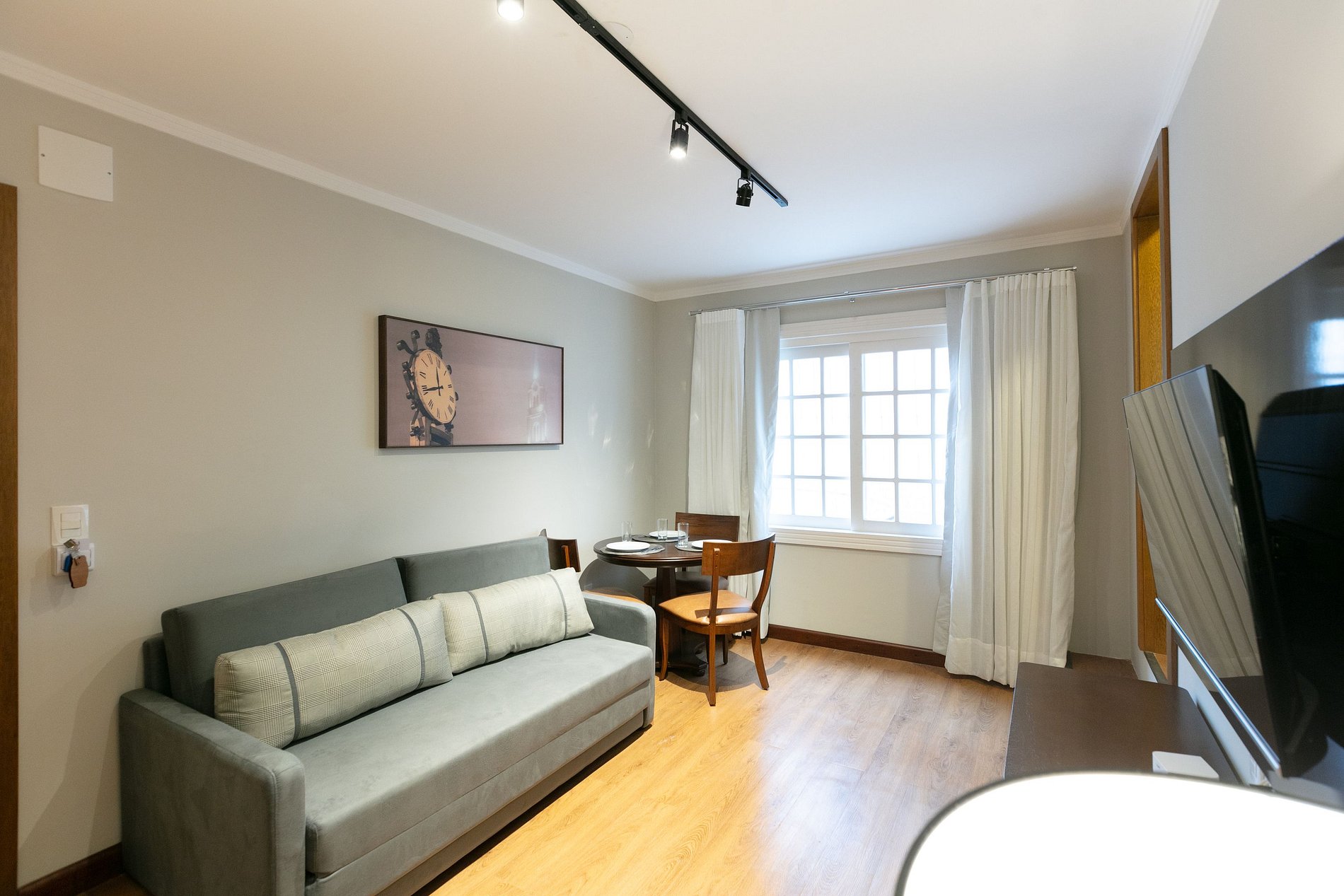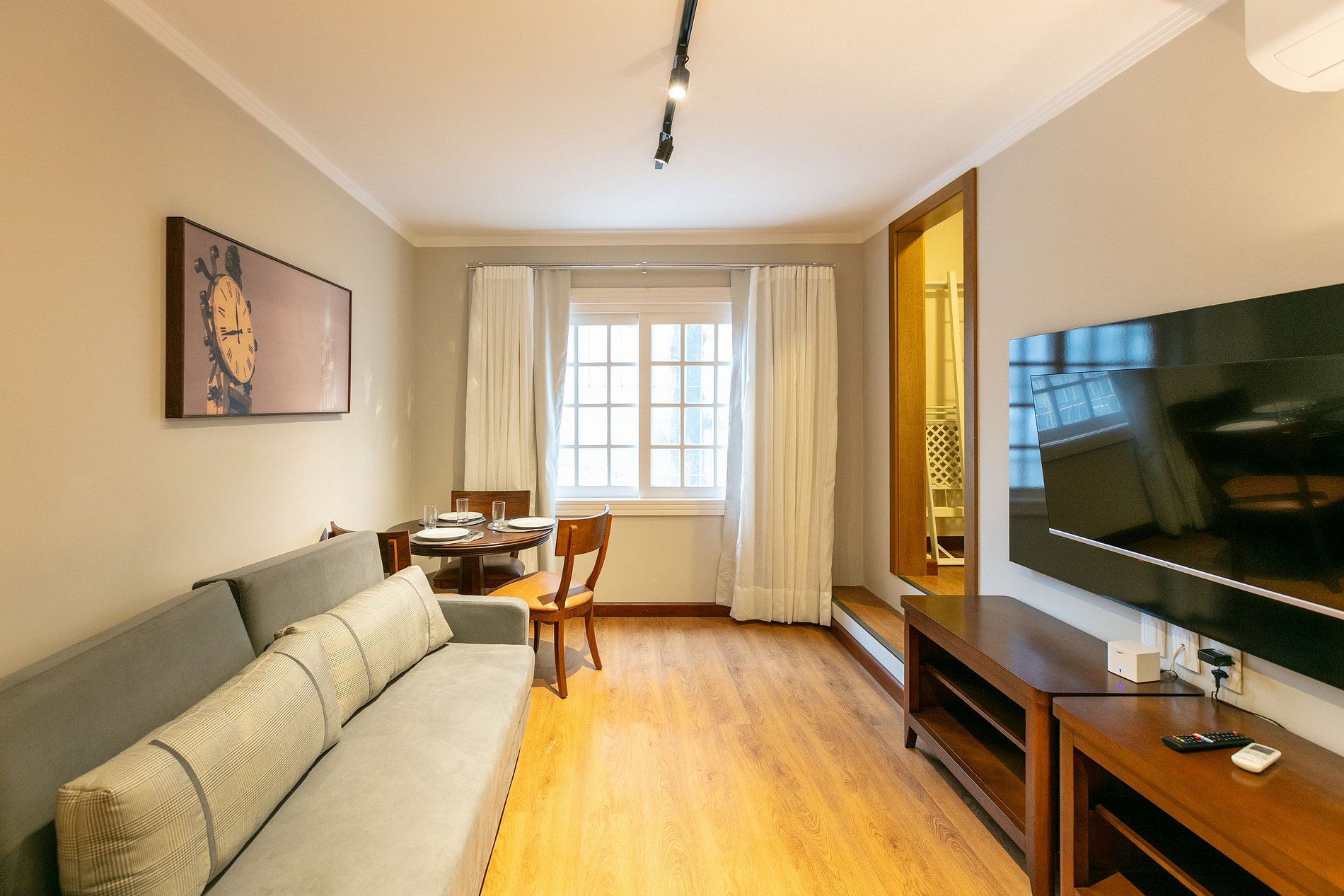 Espaço: Sala de estar arejada e bem iluminada, com sofá confortável e TV de tela plana, ideal para relaxar após um dia explorando a cidade.
