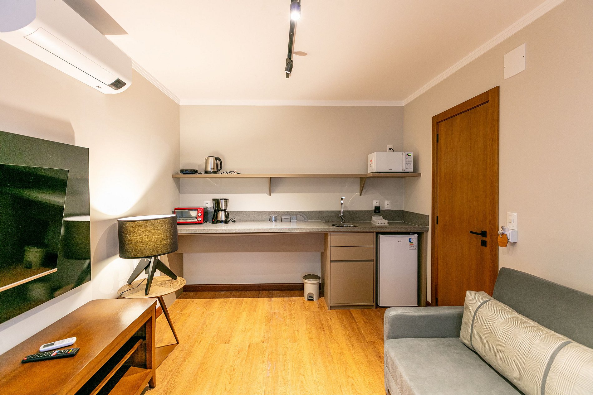 Cozinha: Mini Cozinha equipada com frigobar, micro-ondas e utensílios necessários para um café da manhã ou uma refeição rápida.